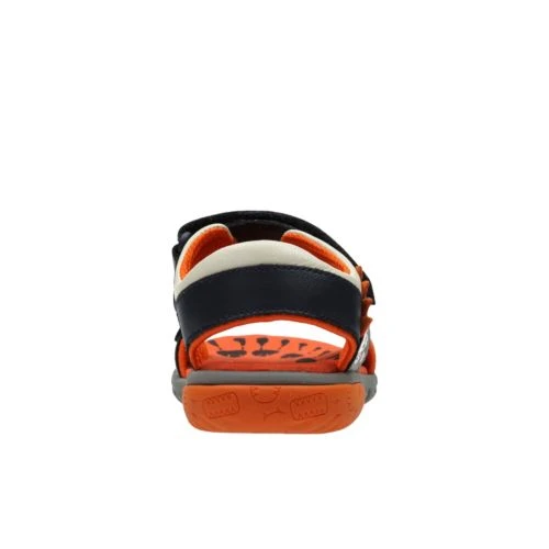 Rocco Surf, kids’ sandals, navy combi leather – With dinosaur detailing on the upper and sock, these summer sandals will be a roaring success. The navy leather upper features orange colour pops and a double riptape fastening for a secure fit. Lightweight and flexible, these sandals use our unique Air Spring FX technology to ensure feet stay comfortable.